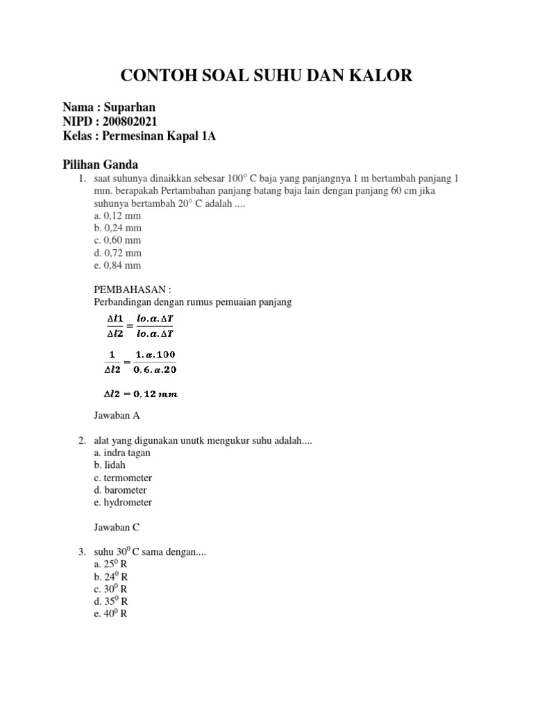 Contoh soal suhu dan pemuaian ini disusun dalam bentuk pilihan berganda dilengkapi dengan pembahasan dan dirancang sedemikian berdasarkan beberapa subtopik yang paling sering keluar dalam kajian suhu dan pemuaian untuk tingkat menengah pertama. Dari benda bersuhu tinggi menuju suhu yang lebih rendah karena bersinggungan. 30 soal latihan pilihan ganda jawabannya bab dinamika penduduk kelas 11 part 2 1. Kalor juga dapat berpindah dari suhu rendah ke suhu yang tinggi apabila dibantu dengan alat, yaitu mesin pendingin. Contoh soal essay preposition dan jawabannya hard to ensure that the paper you are writing will still come out as a good quality paper.
