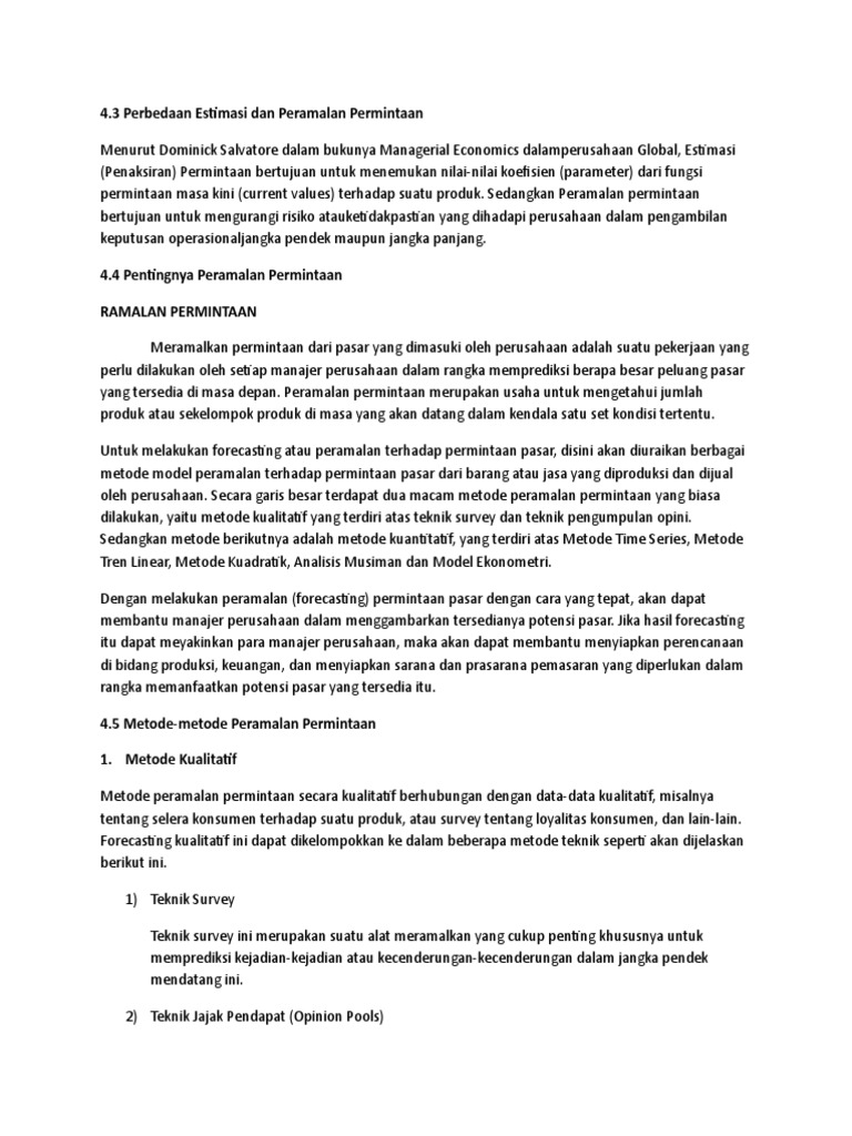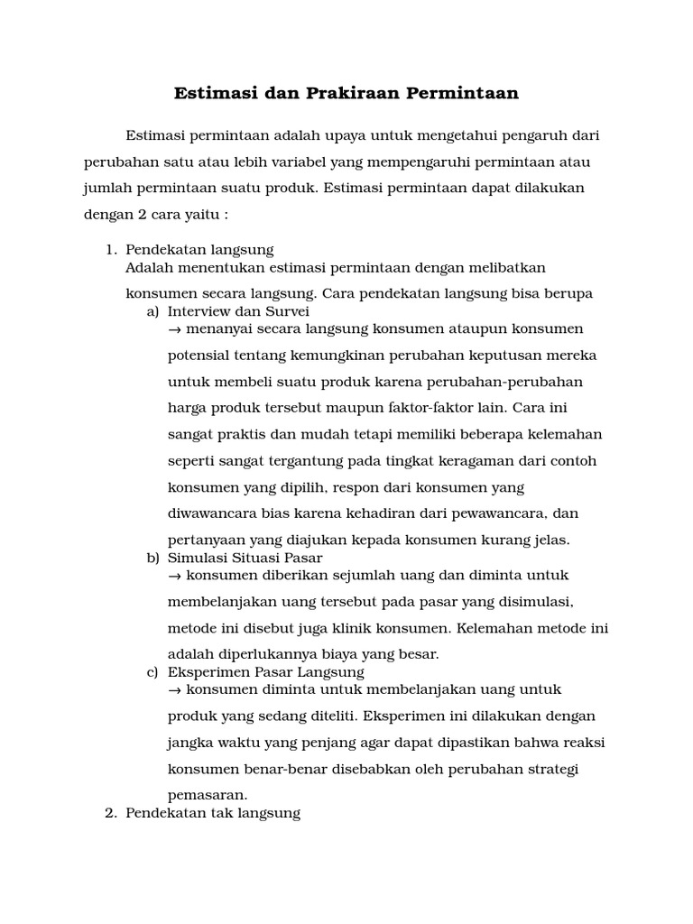 • berapa banyak kenaikan penjualan apabila perusahaan mengeluarkan biaya iklan dalam jumlah. Estimasi permintaan itu ada yang di lakukan secara langsung dan tidak langsung. Mensurvei konsumen bagaimana reaksi terhadap jumlah yang diminta jika ada perubahan harga, pendapatan, dll menggunakan kuisioner penelitian observasi : Estimasi permintaan bab i pendahuluan dalam kegiatan perekonomian, tidak terlepas dari adanya permintaan dan penawaran. Qualitative forecasting techniques 56 6.2.